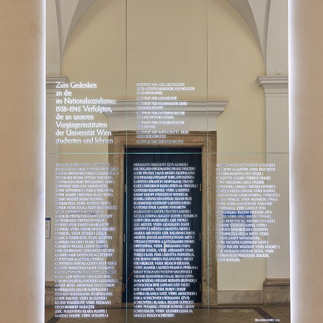 Denkmal für die im Nationalsozialismus vertriebenen Geschichte-Studierenden und -Lehrenden ("Wenn Namen leuchten", Iris Andraschek, 2022)
