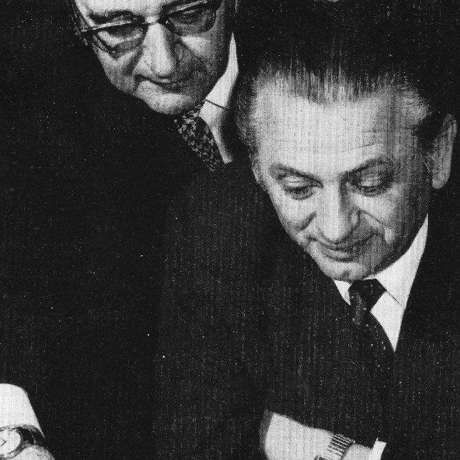 v.l.n.r.: Prof. Dr. Hans-Ulrich Riethmüller (Medizinische Beratung), Dipl.-Ing. Johann Vogel (Bauleitung/für die Republik Österreich), Dr. Franz Ritschl, Oberstadtbaurat Dipl.-Ing. Rudolf Foltin (Bauleitung/für die Stadt Wien), Oberamtsrat Hans Denk, Dir. Dr. Heinz Rode, Mag. Alexander Marchart (Architekt).