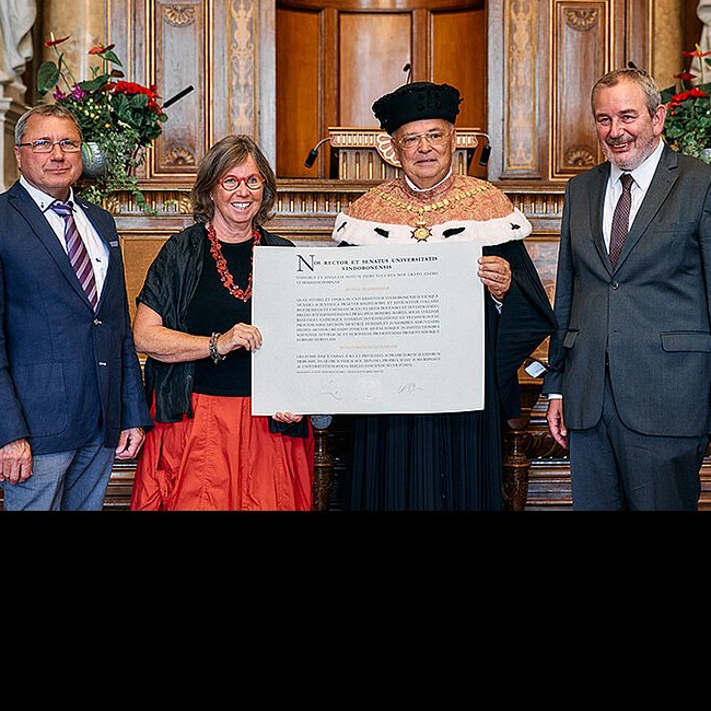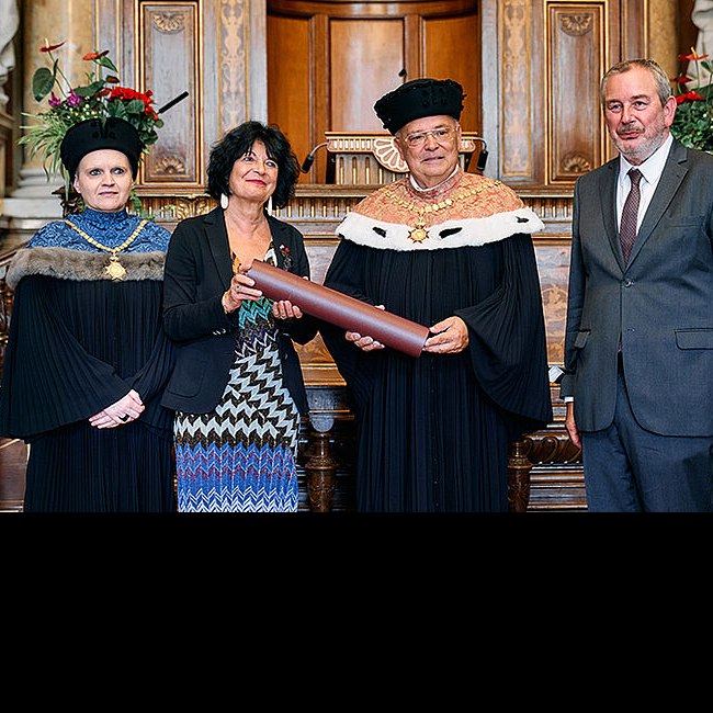 Von links nach rechts: Laudatrix Elizabeta Jenko (Professorin am Institut für Slawistik), Slawistin und Byzantinistin Katja Sturm-Schnabl, Rektor Heinz W. Engl und Senatsvorsitzender Michael Viktor Schwarz