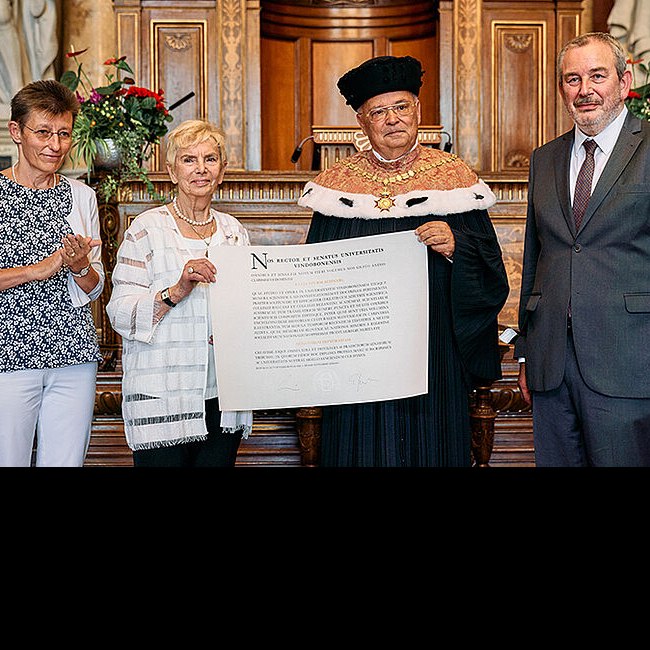 Von links nach rechts: Laudatrix Barbara Schober (Dekanin der Fakultät für Psychologie), Bildungspsychologin Christiane Spiel, Rektor Heinz W. Engl und Senatsvorsitzender Michael Viktor Schwarz
