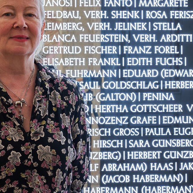 Künstlerin Iris Andraschek vor "Wenn Namen leuchten", Denkmal für im Nationalsozialismus von der Universität Wien vertriebenen Geschichte-Studierenden und -Lehrenden, Mai 2022
