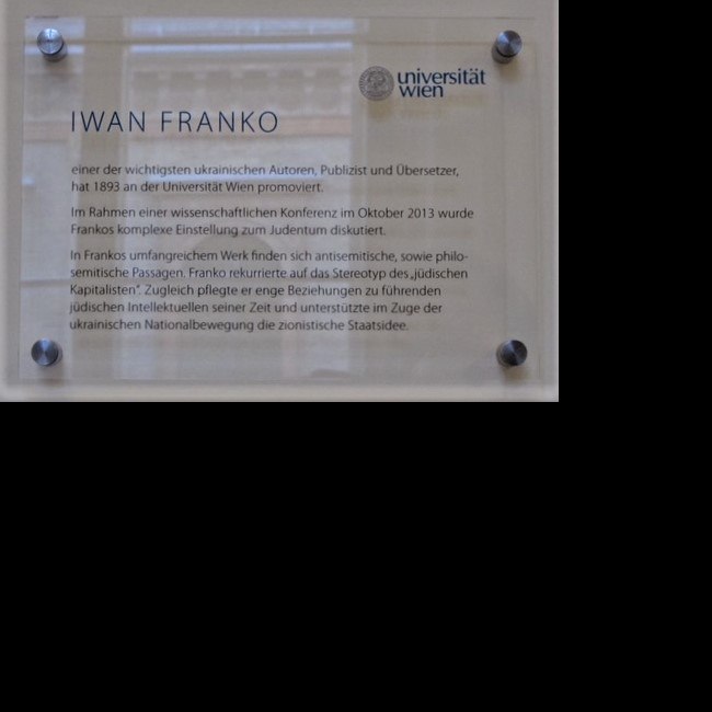Das Denkmal für Iwan Franko wurde am Gang des Instituts für Germanistik im 2. Stock des Hauptgebäudes im Oktober 1993 in Anwesenheit des ukrainischen Kulturministers Iwan Dzjuba und des damaligen österreichischen Wissenschaftsministers Erhard Busek eröffnet (Aufnahme: Zustand 2014)