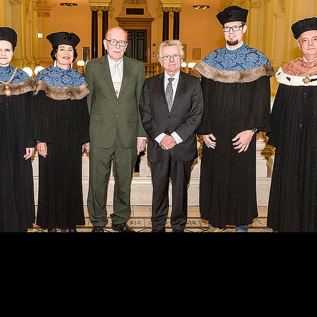 v.l.n.r.: Dekanin Barbara Schober, Laudatorin Christiane Spiel, Peter K. Smith, Niels P. Birbaumer, Laudator Claus Lamm und Rektor Heinz Engl