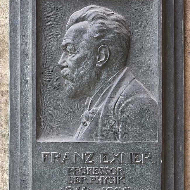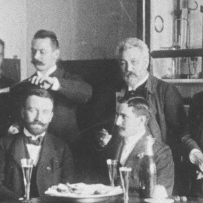 hinten stehend (v.l.n.r.): Egon Schweidler, Hans Benndorf, Felix Exner, Gustav Jäger, Franz S. Exner (5. von links), Cäsar Pomeranz, Anton Lampa,