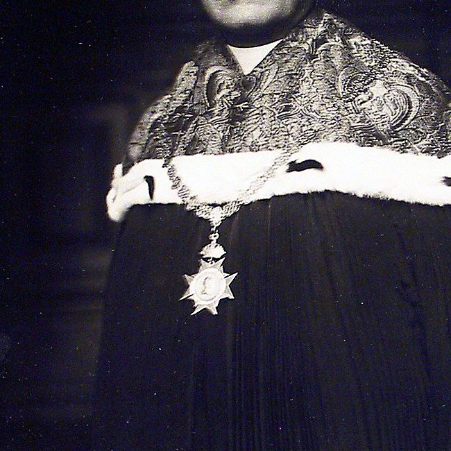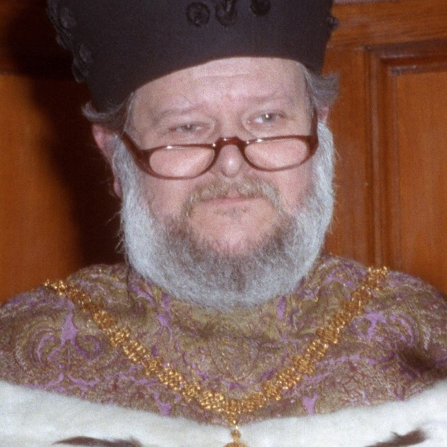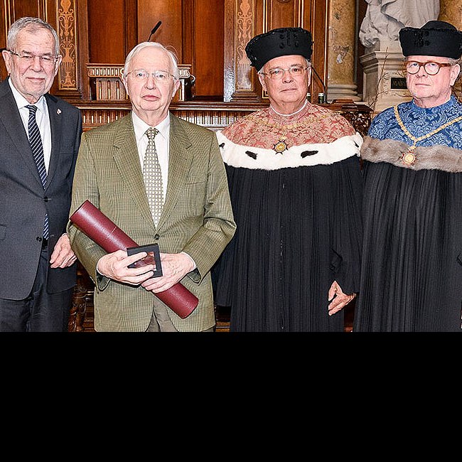 Karl Rudolf Wernhart bei der Inauguration seines Nachfolgers als Rektor, Alfred Ebenbauer, Oktober 1991