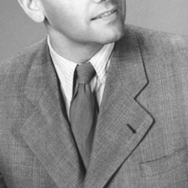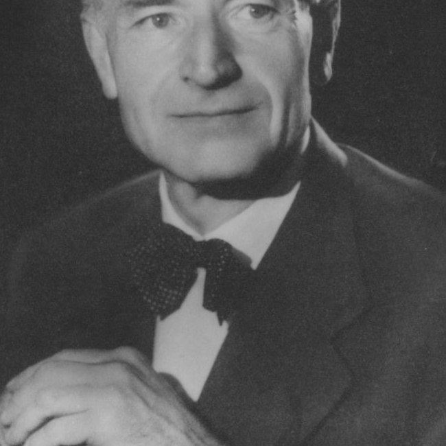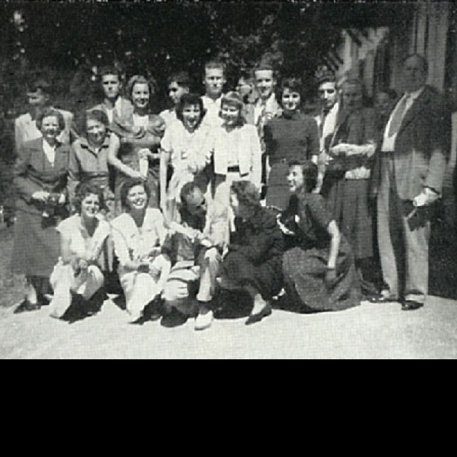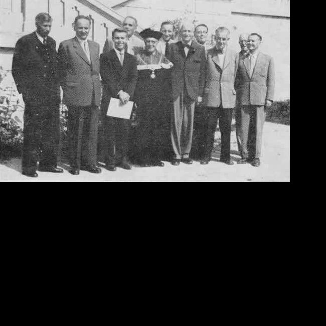 Gruppenbild mit Mitgliedern des Lehrkörpers der Summer School der Universität Wien des Jahres 1952. Abgebildet sind laut Bildunterschrift: Josef Lehrl, Willibald Plöchl, Student Rodler, Hugo Zelzer, Alfred Verdross in Rektorsrobe, Hassfurther, Heinrich Benedikt, Ritschl, Strouhal, Waldmann, Leopold Scheidl.