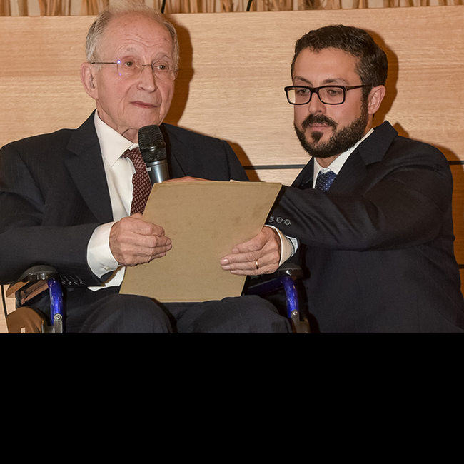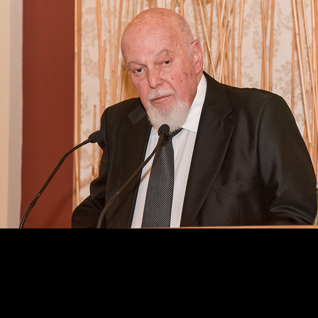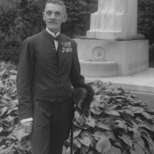 Das Bild zeigt den Oberpedellen der Universität Wien in Beamtenuniform mit Ordensspange vor dem Kastaliabrunnen im Arkadenhof der Universität Wien.