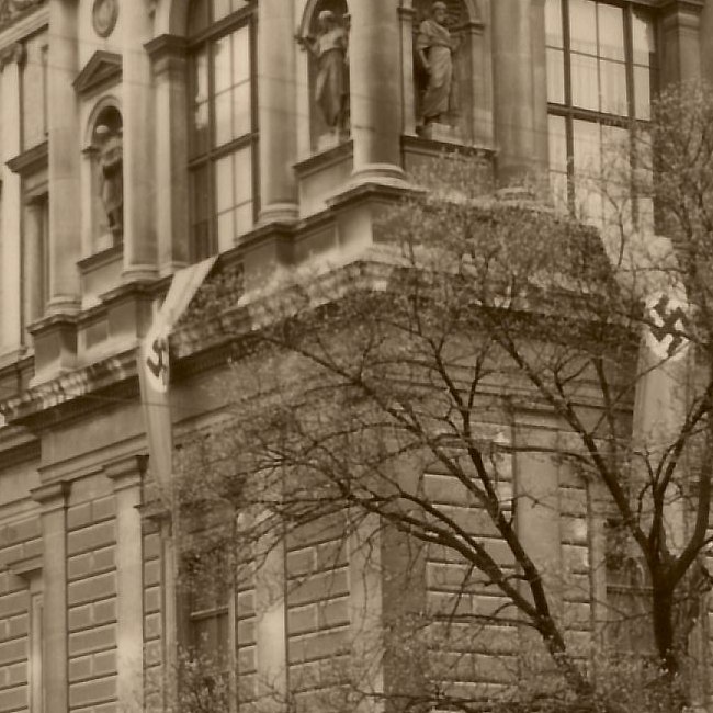 Foto der Wiener Universität nach dem "Anschluss" mit Hakenkreuzbeflaggung, entstanden in der Zeit vom 13. März bis 1. Mai 1938.