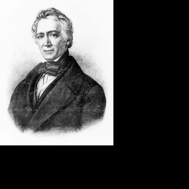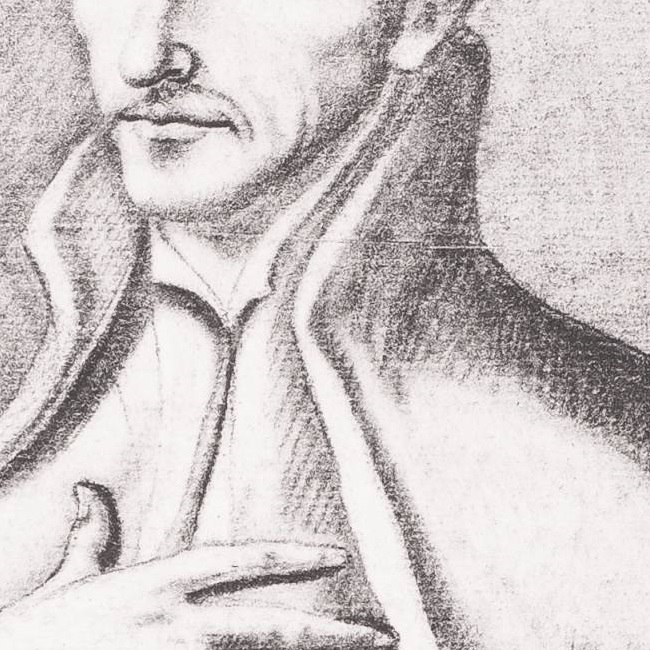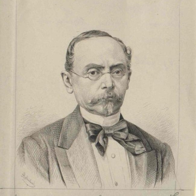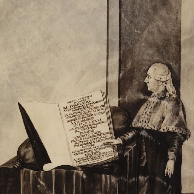 Rhein mit der rechten Hand auf ein Buch mit seiner Gedenkrede auf Maria Theresia zeigend