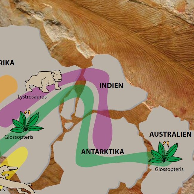 Die Gattung Glossopteris der ausgestorbenen Pflanzengruppe der Samenfarne gab der Pflanzenwelt des Gondwana-Kontinents zur Zeit des Perm ihren Namen. Fossile Blattabdrücke von Glossopteris-Arten finden sich im Gestein des gesamten Gondwana-Kontinents. Die Karte zeigt die paleobiogeographischen Verbreitungsgebiete von Glossopteris und dreier Vertreter säugetierähnlicher Reptilien.