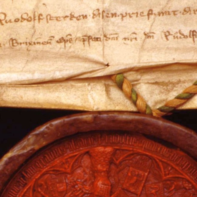 Die Existenz des Universitätssiegels wird bereits in der Gründungsurkunde erwähnt. Der Typar soll im Auftrag Herzog Rudolfs IV. von dem Goldschmiedemeister Janko von Prag 1365 angefertigt worden sein. Vorbild war das Siegel der Universität Paris.