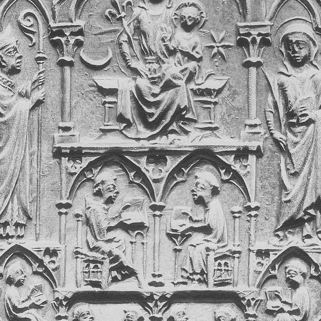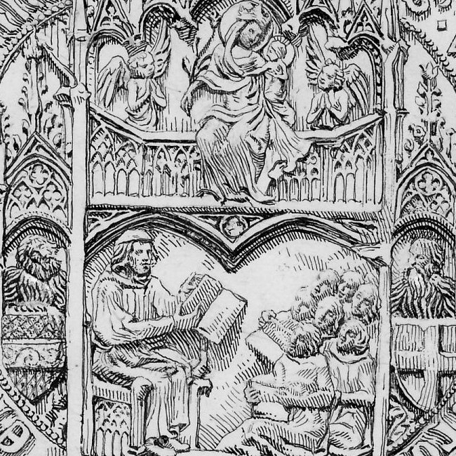 Ein lehrender Magister mit seinen Schülern unter einem gotischen Baldachin, außerhalb die Wappen Wiens und Österreichs, oberhalb die Madonna mit ihrem Kind, umgeben von zwei Engeln.