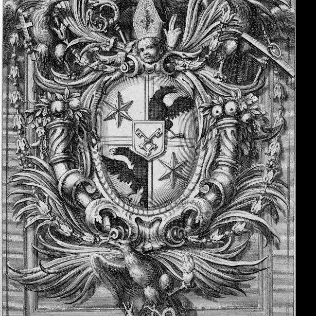 Barockes Wappen eines Abtes von Stift Melk (vermutlich Abt Berthold Dietmayr) mit zwei halben Adlern, Sternen und den in jedem Abtwappen von Melk vorkommenden gekreuzten Schlüsseln.