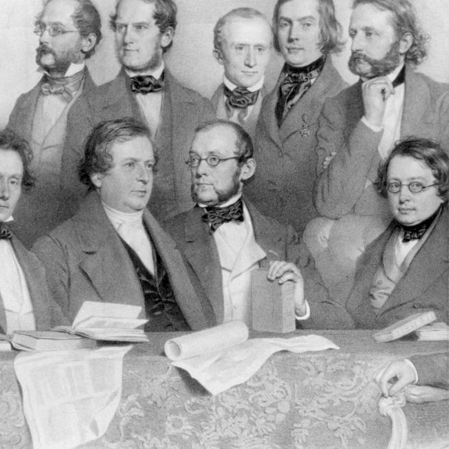 Sitzend von links nach rechts: Franz Schuh, Anton von Rosas, Carl Freiherr von Rokitansky, Josef Skoda, Johann Heinrich Dumreicher.
