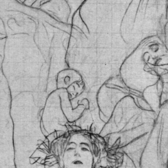 Entwurf von Gustav Klimt für eines von vier "Fakultätsbildern", die zur Ausschmückung der Decke des Großen Festsaales von der Universität Wien in Auftrag gegeben wurden. Nach massiver öffentlicher Kritik an Klimts Darstellungsweise kaufte der Künstler die Bilder zurück, die bis zu ihrer Zerstörung 1945 in Privatbesitz verblieben.