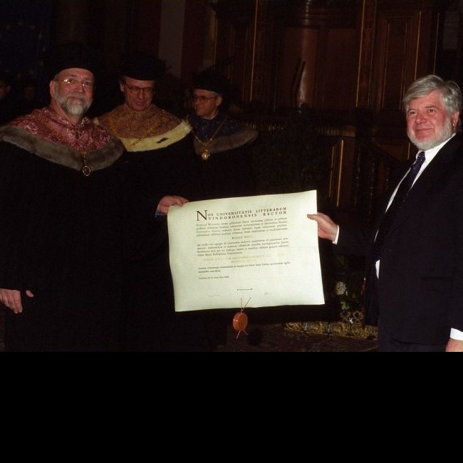 Roger Wets bei der Verleihung des Ehrendoktorats durch Dekan Günther Haring und Rektor Georg Winckler