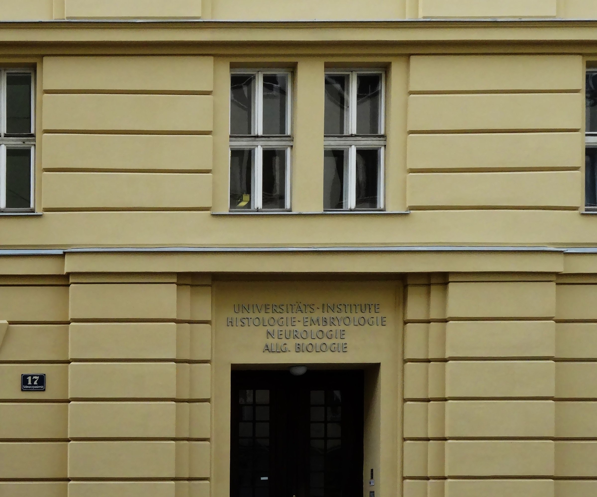 Eingang zu den Instituten für Histologie und Embryologie, Neurologie und Allgemeine Biologie, Schwarzspanierstraße 17 (Ecke Währinger Straße 13)