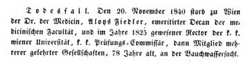 Im Alter von 78 Jahren starb Alois Fiedler an „Bauchwassersucht“. Als Erbinnen seiner Verlassenschaft wurden in einer Bekanntmachung der Wiener Zeitung genannt: Frau Elisabeth Paravicini, geb. Fiedler, Amalia und Johanna Fiedler sowie Maria Biedermann, geb. Fiedler.