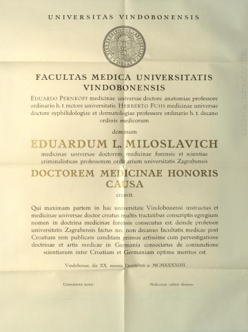 „Die wissenschaftlichen Verdienste des Dr. Miloslavich reichen wohl auch nicht annähernd an jene des Hofrates Prof. Dr. Ernst Ludwig heran, der im Jahre 1882 mit dem akademischen Ehrendoktorat ausgezeichnet wurde, oder an jene des Prof. Dr. Hans Horst Meyer, der im Jahre 1937 anlässlich der 100-Jahrfeier der Wiener Gesellschaft der Ärzte in gleicher Weise geehrt worden ist. Außerdem sei das Ehrendoktorat des Dr. Miloslavich schon aus formalen Gründen anfechtbar, weil dieser seinen medizinischen Doktorat [sic] seinerzeit an der Wiener Universität erworben hat.“