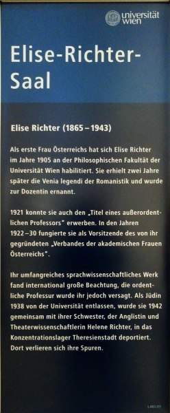 Elise Richter habilitierte sich 1905 als erste Frau an der Universität Wien und erhielt 1907 die Lehrberechtigung für romanische Philologie sowie eine unbezahlte Dozentur. Am 29. August 1921 erhielt sie als erste Frau in Österreich den Titel (aber nicht die Position) eines außerordentlichen Universitätsprofessors und einen Lehrauftrag für Romanische Sprachwissenschaften, Literatur und Phonetik. Ab 1928 leitete Elise Richter das phonetische Institut der Universität Wien. Der Titel und die Position eines Ordinarius blieb ihr jedoch verwehrt. 1922 gründete sie den „Verband der Akademikerinnen Österreichs VAÖ“, dessen Vorsitzende sie bis 1930 blieb.