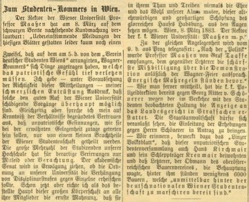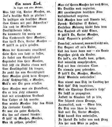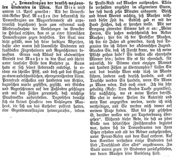 Die Demonstrationen gegen ihn wurden einige Monate später nochmals verstärkt: Maassen, der als Rektor auch Mitglied des niederösterreichischen Landtags war, trat am 20. Juni 1883 dort in einer Rede entschieden für die tschechischen Schulen in Wien sowie Niederösterreich ein. Mit seinem Plädoyer für eine Gleichberechtigung der anderen Sprachen der Monarchie gegenüber dem Deutschen verteidigte die dahingehende Politik der Regierung. Lang anhaltende Studentenunruhen unter der Ägide der deutschnationalen Korporationen, eine Protestnote von 63 der 74 ordentlichen Professoren der Universität Wien sowie eine hasserfüllte Berichterstattung zahlreicher Medien gegen den Konvertiten aus Deutschland waren die Folge. Die Aufstände der Studenten setzten sich auch im Oktober 1883 fort, als Maassen nach den Sommerferien im neuen Hauptgebäude seine Vorlesungstätigkeit wieder aufnahm.