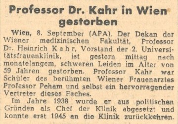 Unmittelbar nach Kriegsende 1945 wurde Heinrich Kahr als Vorstand der II. Frauenklinik an die Universität Wien zurückberufen und zum ordentlichen Professor ernannt. Als das Staatsamt (später Ministerium) für Unterricht im August 1945 mit der politischen Überprüfung und Entnazifizierung des Lehrkörpers der Universität Wien begann, gehörte Kahr als stellvertretender Beisitzer der Sonderkommission I. Instanz an, die über eine mögliche Weiterverwendung der „belasteten“ Professoren an der Universität Wien entschied.