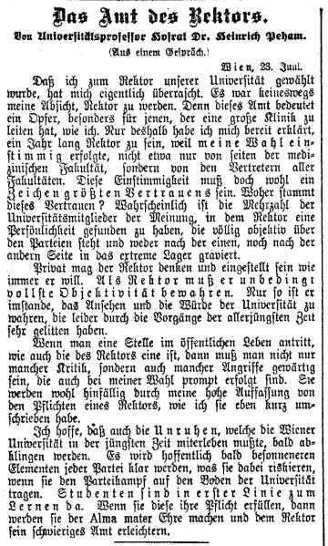Peham nahm damit Bezug auf die wiederholten gewalttätigen Angriffe nationalsozialistischer bzw. deutschnationaler Studenten gegenüber jüdischen und linken KollegInnen, appellierte an das Pflichtbewusstsein der Studierenden und betonte: „Studenten sind in erster Linie zum Lernen da“. Seine Absicht, im Rektorsamt als als „vorurteilsloser Schiedsrichter“ objektiv und ausgleichend wirken zu wollen, unterstrich er in einem weiteren Zeitungsinterview, in dem er auch ankündigte, jegliche politische Propagandatätigkeit, Vorträge oder Kundgebungen aller Studentenverbindungen innerhalb der Universität zu verbieten. Wenn die Studierenden es vermieden, die Universität „als Herd politischer Auseinandersetzungen zu entweihen“, sei ein polizeiliches Einschreiten in der Universität gänzlich unnötig (Wiener Allgemeine Zeitung, 12.10.1927).