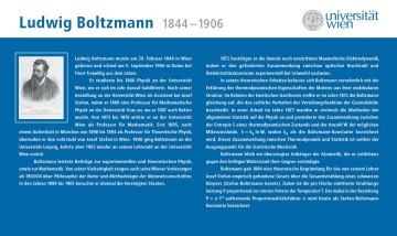 Ludwig Boltzmann (1844-1906), Mathematiker, Physiker, studierte ab 1863 an der Universität Wien Geschichte, Pädagogik, Mathematik und Physik (Dr. phil. 1866), wurde 1867 Assistent Josef Stefans am Physikalischen Instituthabilitierte 1868 zum Privatdozent, 1869 o. Prof. der mathematischen Physik an Universität Graz, 1873 als Prof. der Mathematik an die Universität Wien berufen, ging aber 1876 als Prof. der Experimentalphysik und Leiter des Physikalischen Instituts wieder nach Graz und 1890 als Professor der Theoretischen Physik nach München. 1894-1900 war er Prof. der Theoretischen Physik wieder an der Universität Wien. 1900-1902 Professur für Naturphilosophie in Leipzig, kehrte aber wieder nach Wien zurück, wo er bis zu seiner Emeritierung (1904) als Nachfolger von Ernst Mach auch den Lehrstuhl für Naturphilosophie innehatte.