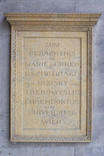 Die sozialkritisch-humanistische Schriftstellerin Marie von Ebner-Eschenbach beleuchtete in ihrem Romanen die gesellschaftlichen Entwicklungen der ausgehenden Donaumonarchie. Sie erhielt 1900, drei Jahre nach der Zulassung von Frauen als ordentliche Studierende an der Philosophische Fakultät der Universität Wien, als erste Frau das Ehrendoktorat der Universität Wien (Laudator Jakob Minor). Zu ihren Ehren wurde eine Gedenktafel im Arkadenhof der Universität Wien angebracht.