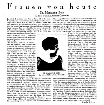 Daneben engagierte sie sich in mehreren Vereinen für die österreichische Frauenbewegung, insbesondere im Kontext der rechtlichen Gleichstellung der Frau und war Marianne Beth war äußert produktiv publizistisch tätig.