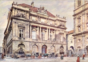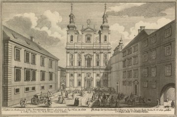 Kupferstich von H. Sperl nach einer Zeichnung von Salomon Kleiner mit dem Titel  (Text im Bild): "Templum et Academicum Collegium Societatis Jesu fundatum ab Imp. Ferdinado II. anno 1628". Erschienen 1724 in dem Werk "Wahrhaffte und genaue Abbildung aller Kirchen und Clöster, welche sowohl in der keyserl. Residenz-Statt Wien als aus in denen umliegenden Vorstätten sich befinden".