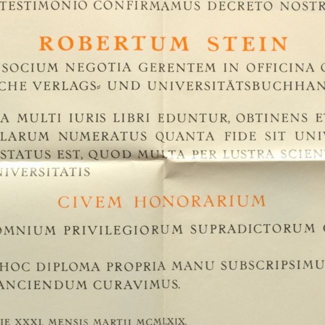 Ehrenbürgerdiplom für Robert Stein (1899-1970), der in dritter Generation den für Jurist*innen zentralen Wiener MANZ-Verlag leitete Robert Stein, Ehrenbürgerdiplom, 1969 Robert Stein, Dr. jur.