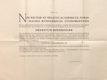The foundation of the research institute in Faskegasse (today: Dr. Boehringer-Gasse) was one of the reasons that he was made an honorary citizen of the University of Vienna on February 5, 1962 for his services to pharmaceutical research in Vienna at the request of Prof. Franz Theodor Brücke and Prof. Hans Tuppy of the Medical Faculty. The motion stated: